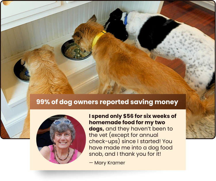 “As a single, retired guy who doesn't cook much, I was a little nervous about making food for my dogs but these recipes are SO easy. All three of my dogs have more energy, they shed less and I'm saving money from buying expensive kibble.”
